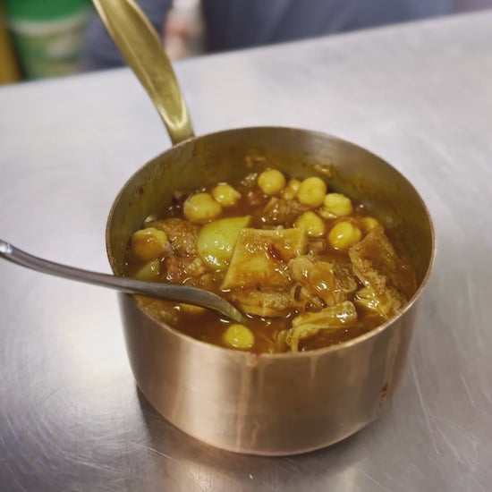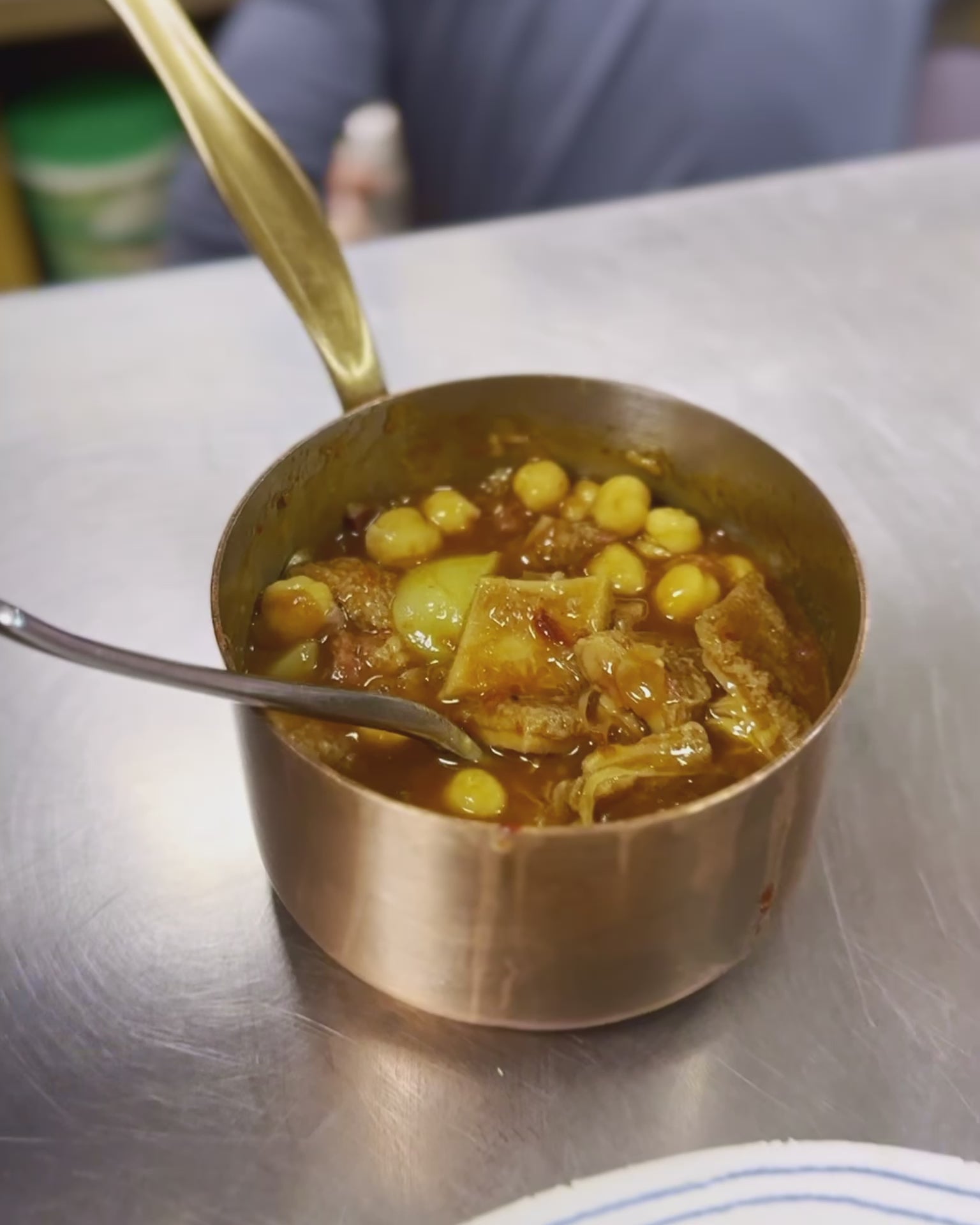 Ingredientes: tripa, cabeza de ternera, chorizo dulce y picante, pimentón dulce y picante, tomate, cebolla caramelizada, ajo, garbanzos, jamón ibérico, azafrán, brandy, tomillo, laurel, guindillas, aceite de oliva virgen, caldo de pollo y sal.