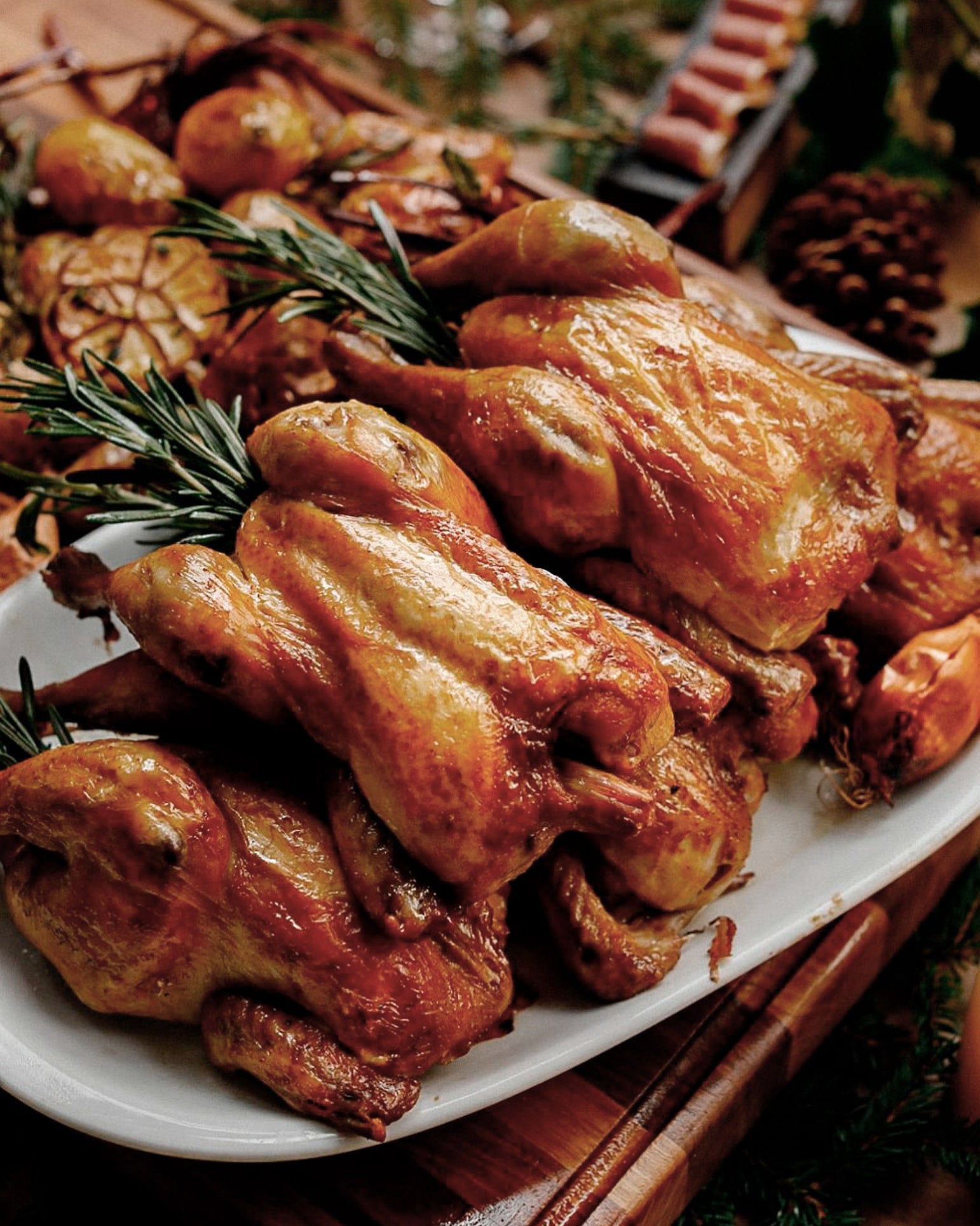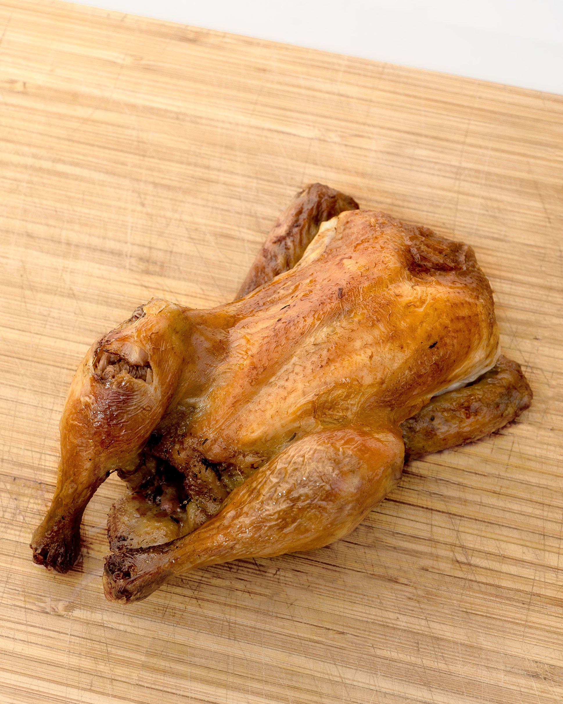 Coquelete, pollo tomatero o picantón entero ahumado en mantequilla y cocido a baja temperatura con un toque de tomillo y pimienta blanca.