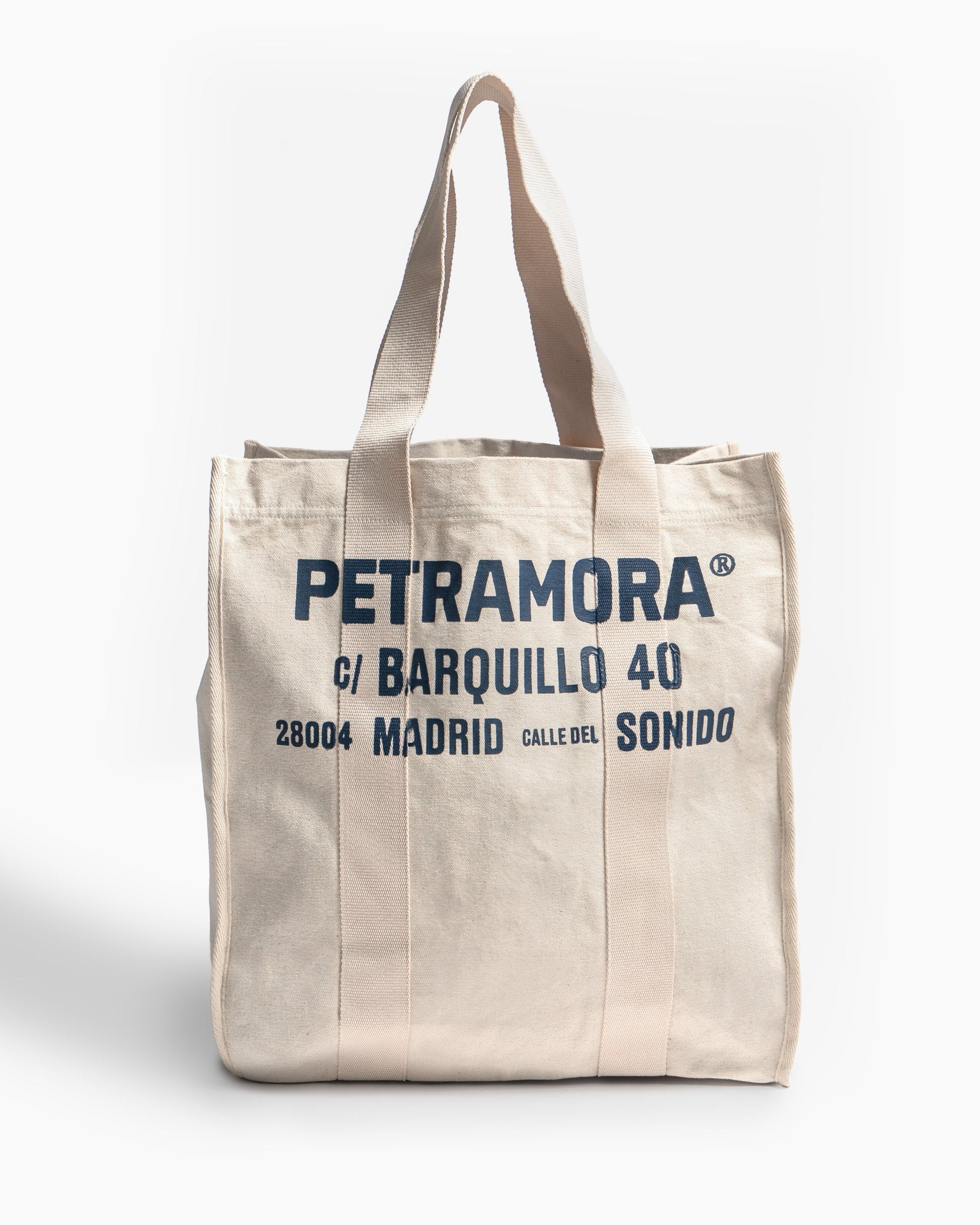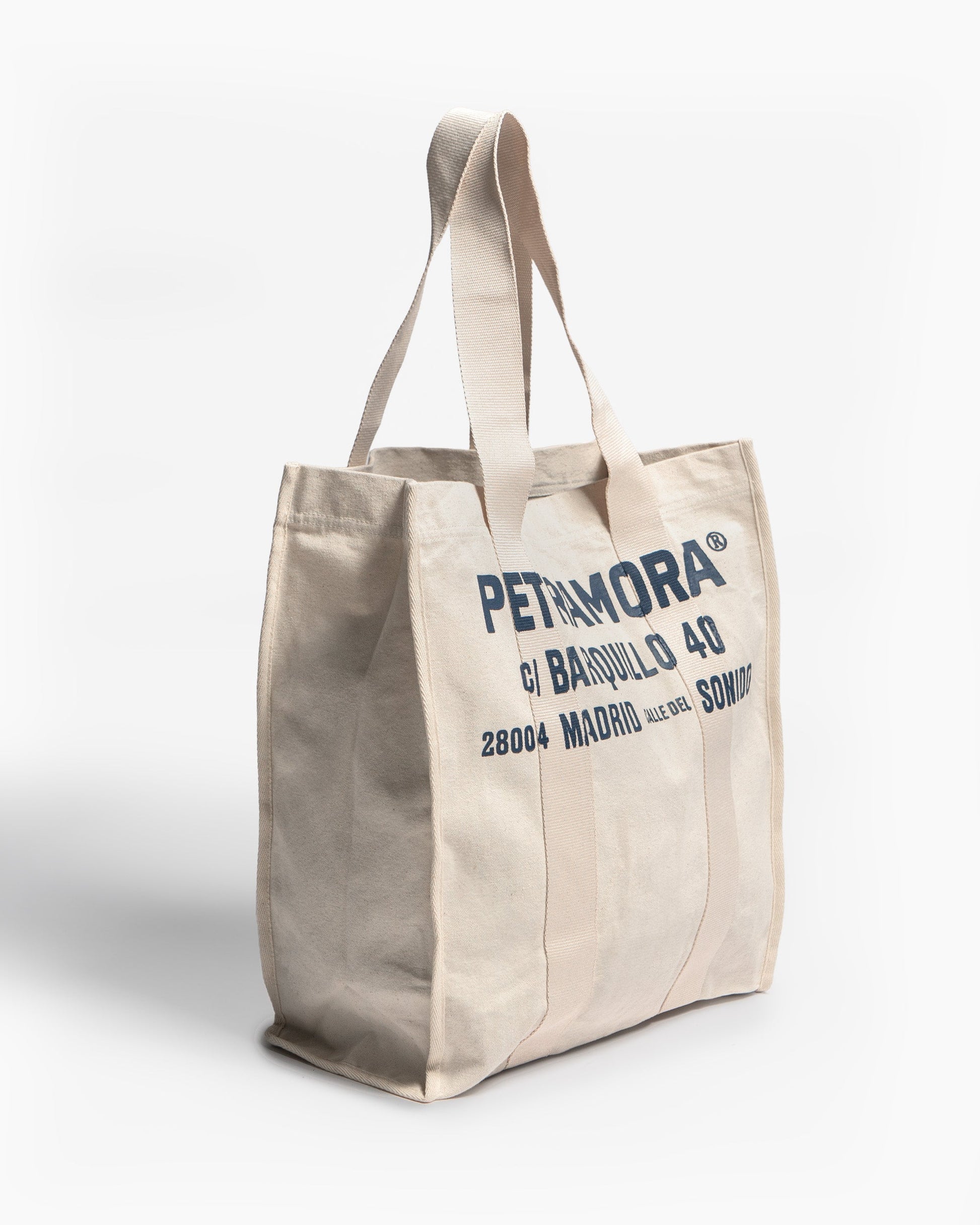 Bolsa macuto de algodón color crema de tamaño grande con asa de hombro. Bosillo interior y exterior con logo estampado.