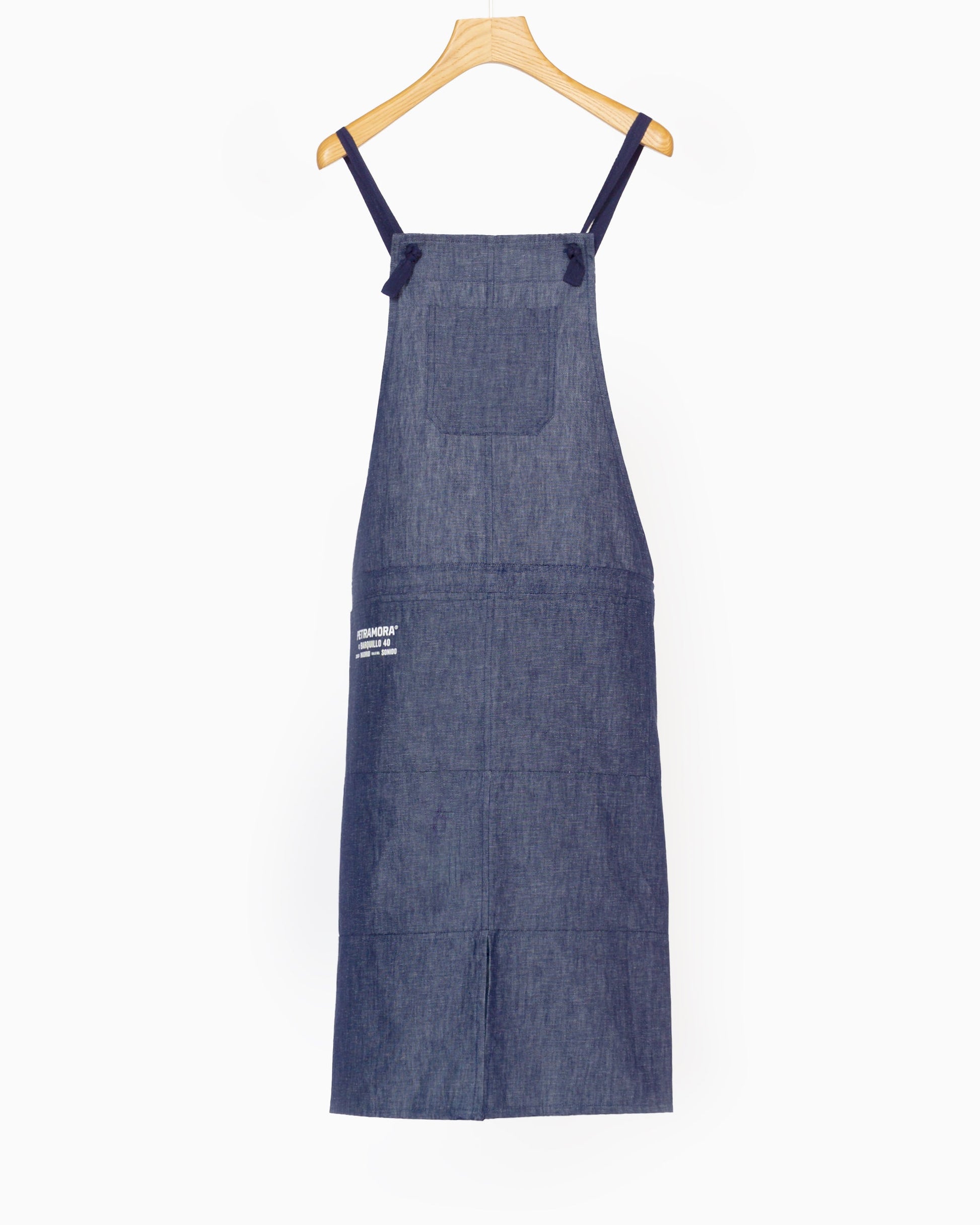 Delantal de color azul marino con logo estampado. Cierre de tirantes cruzados por la espalda y tres bolsillos frontales.Material: 65% algodón 35% linoColor: Navy