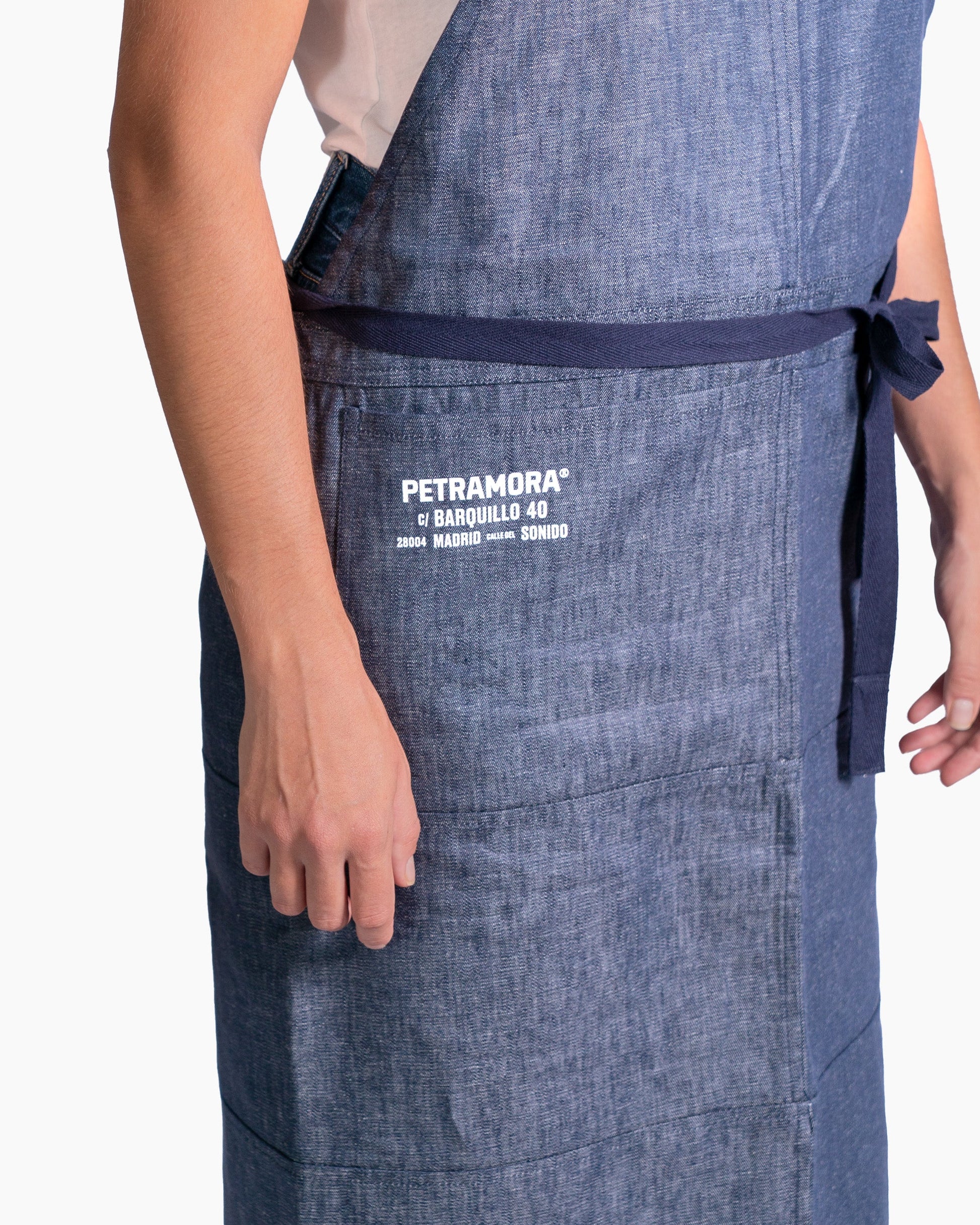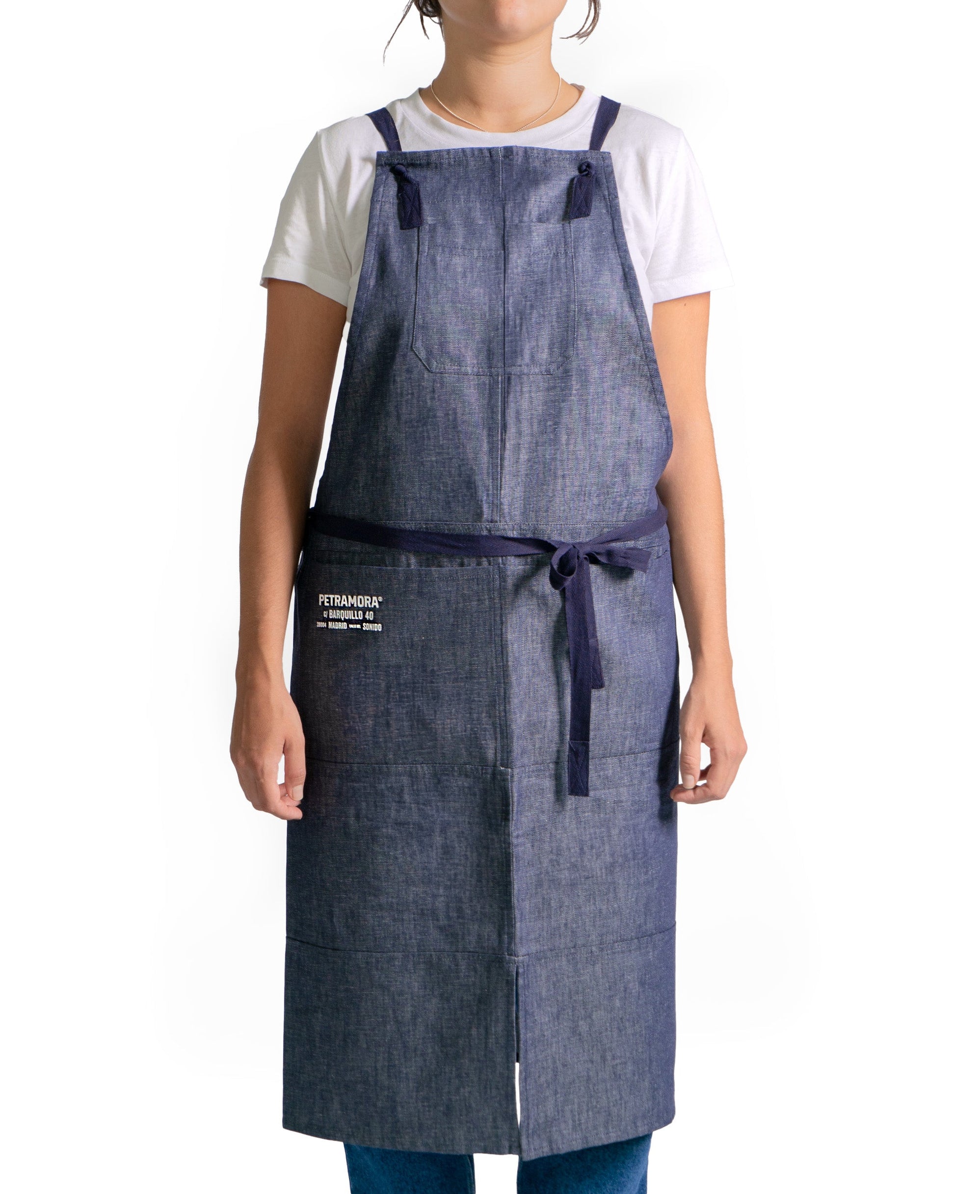 Delantal de color azul marino con logo estampado. Cierre de tirantes cruzados por la espalda y tres bolsillos frontales.