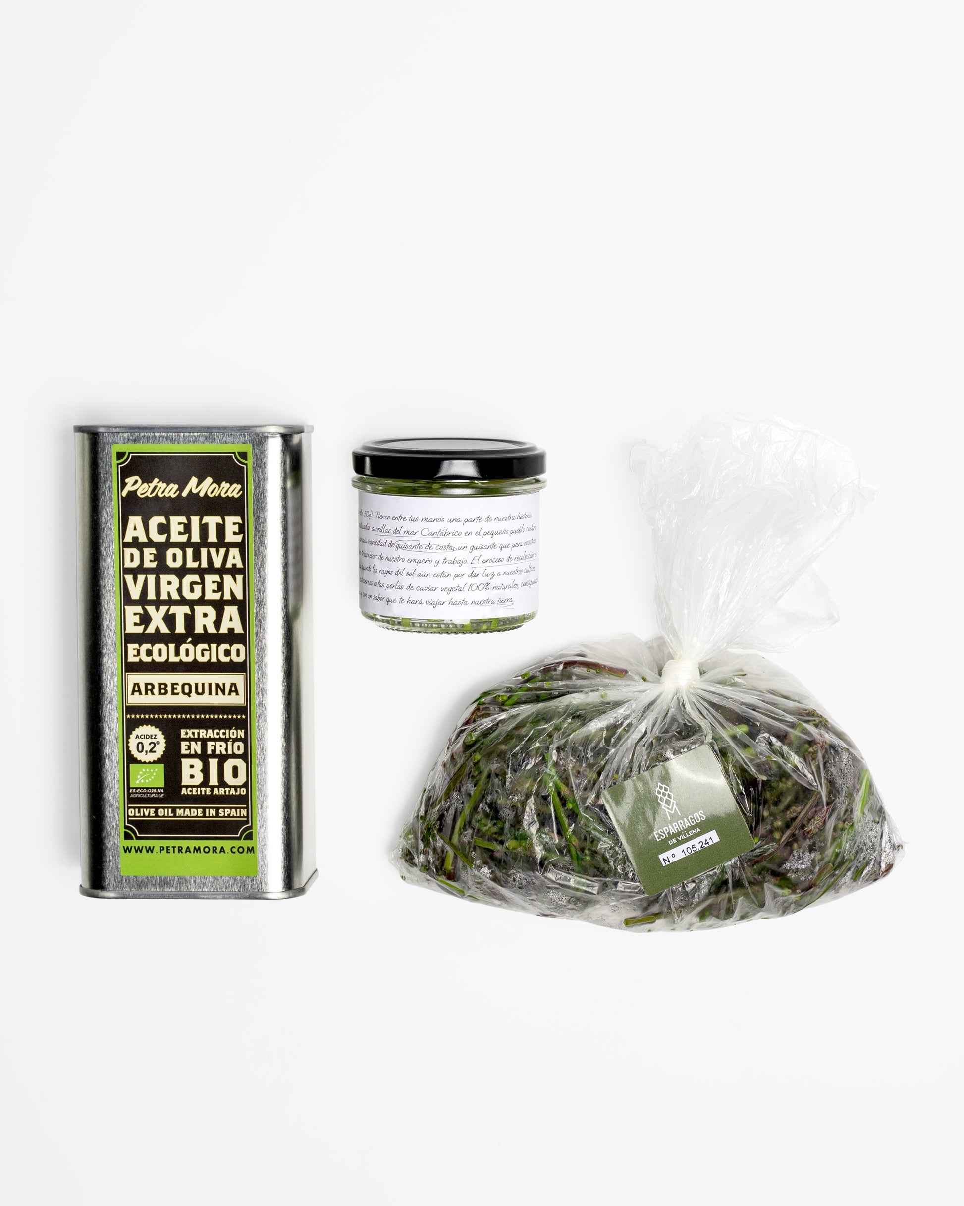 Pack compuesto por dos estacionales y un AOVE: 1 ud. Esparraguines 100g: Los esparraguines son las brácteas inmaduras de la planta esparraguera, cultivados en Villena (Alicante) por Carlos Camañes. 1... Ver más