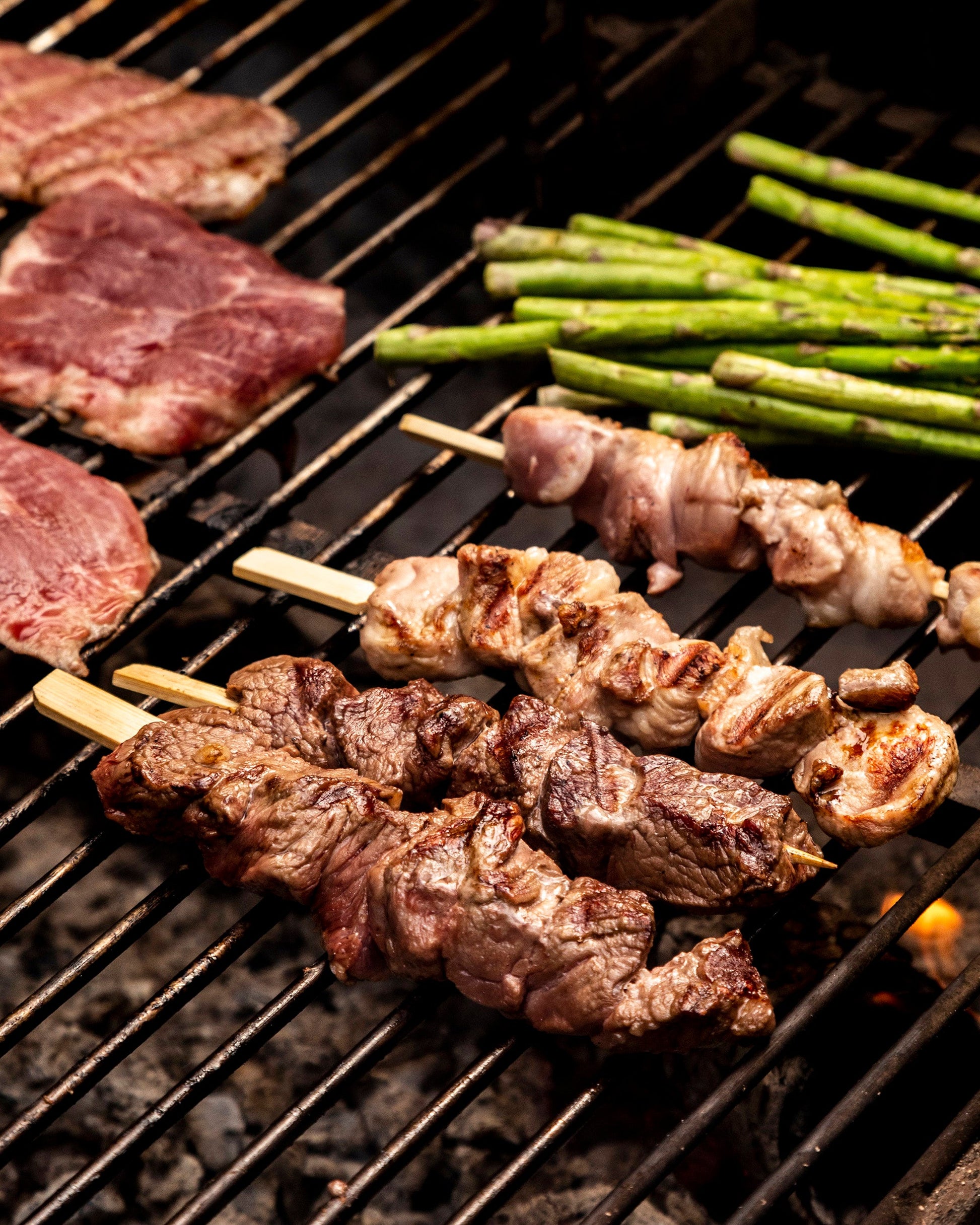 Brochetas de ternera parda de montaña, procedente de la picaña (también conocida como tapilla), adobadas con condimento cajun de Black Pepper: una mezcla de especias que contiene pimienta negra, blanca, tomillo, chipotle, pimentón, ajo y cebolla.