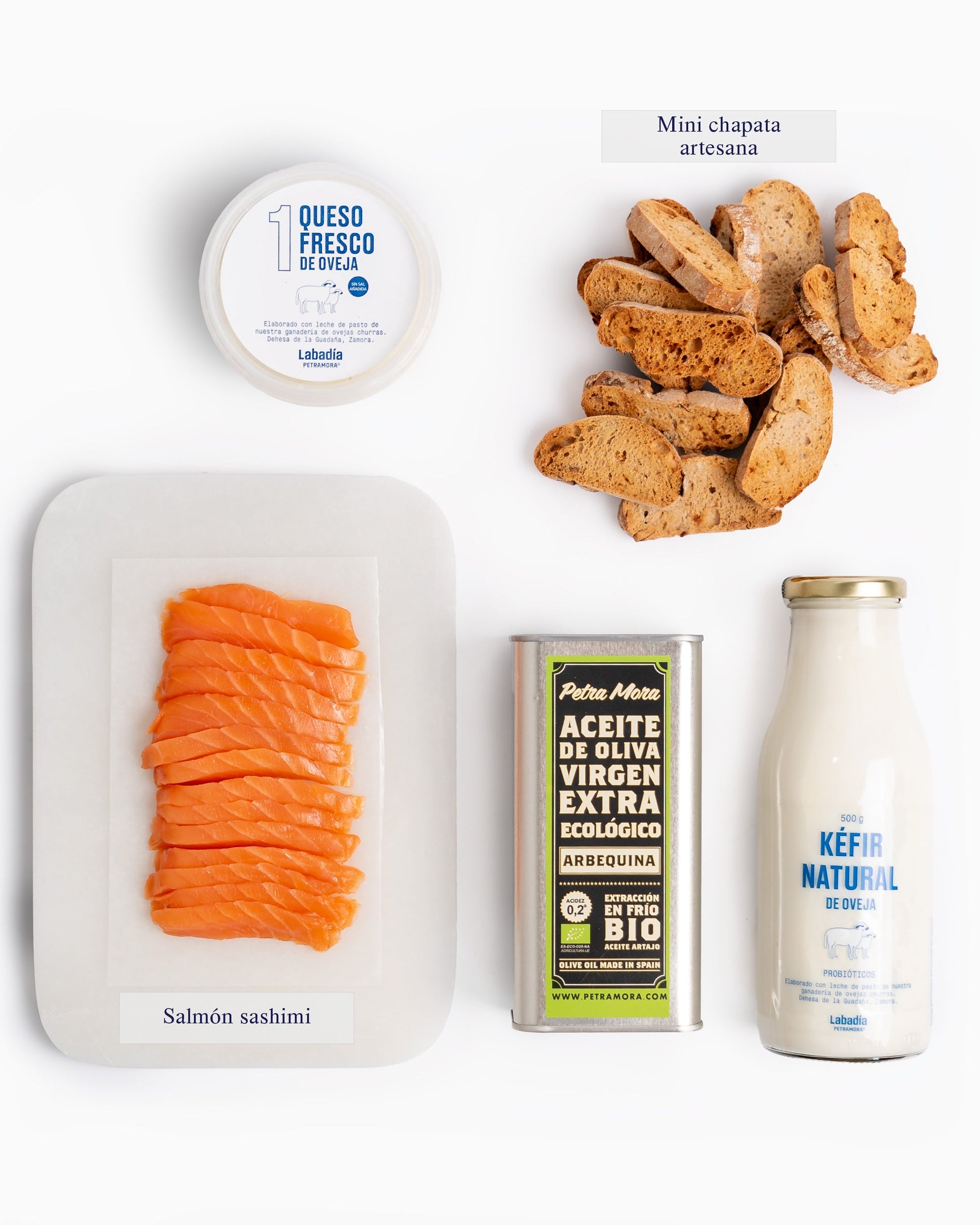 Pack regalo compuesto por: 1 ud. de Labadía 1 fresco: Queso fresco elaborado con la producción de leche de nuestras ovejas churras. 1 ud. de Salmón ahumado sashimi 150g: Salmón...