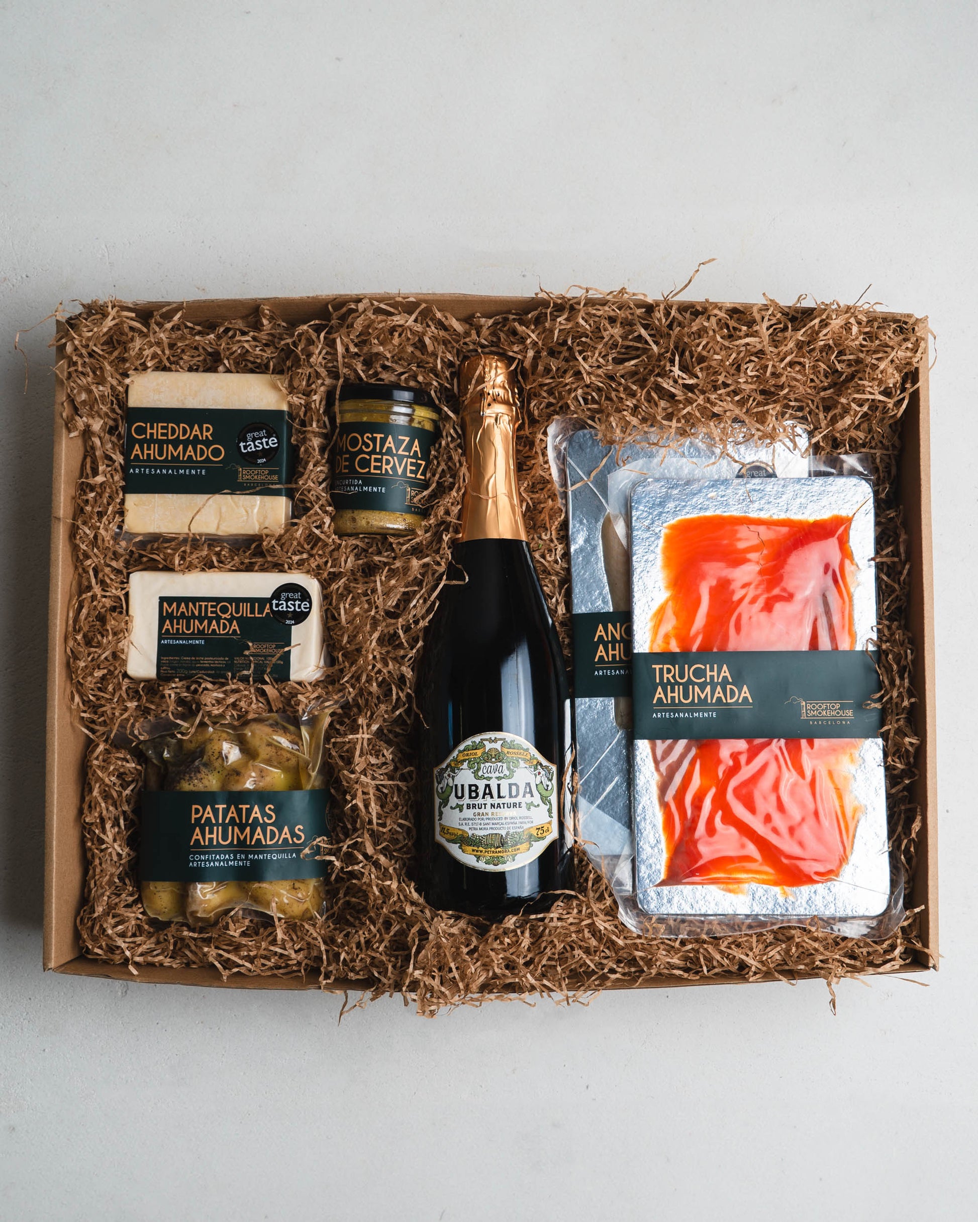 Cesta de nuestro productor Rooftop Smokehouse y Cava Gran Reserva. Compuesto por: