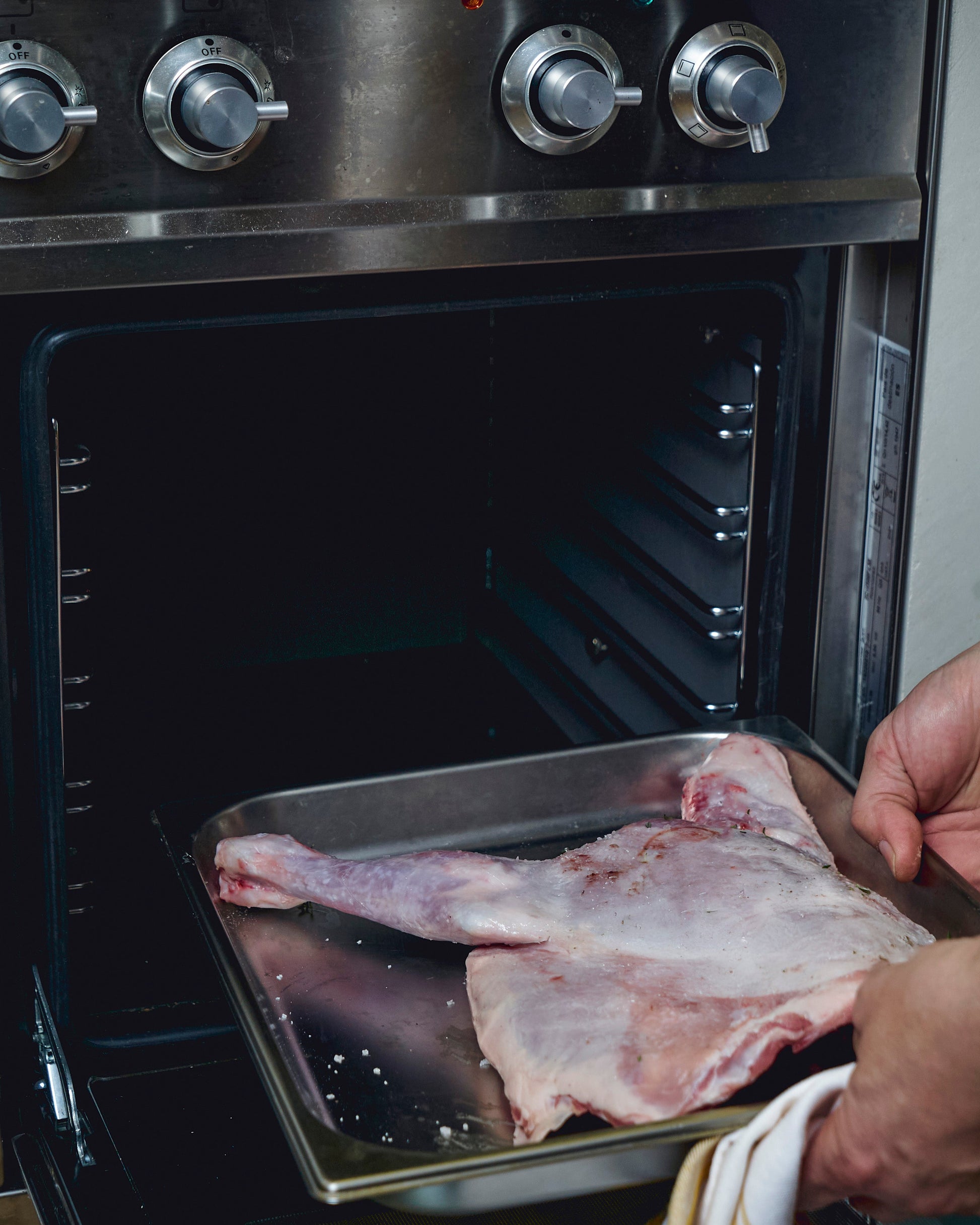 1. Dejamos templar los cuartos de lechazo fuera del frigorífico hasta que alcance temperatura ambiente.