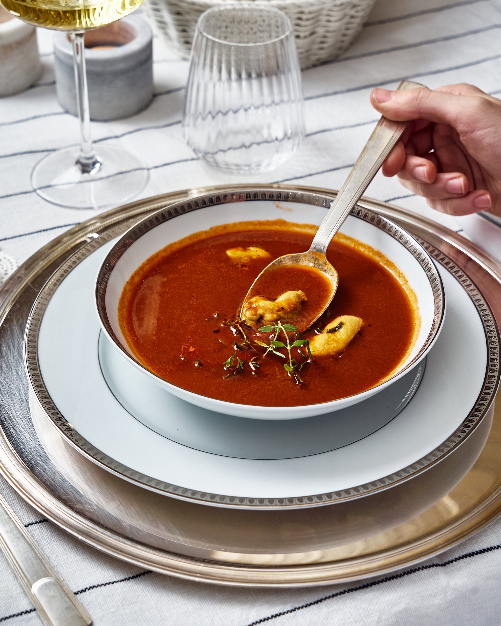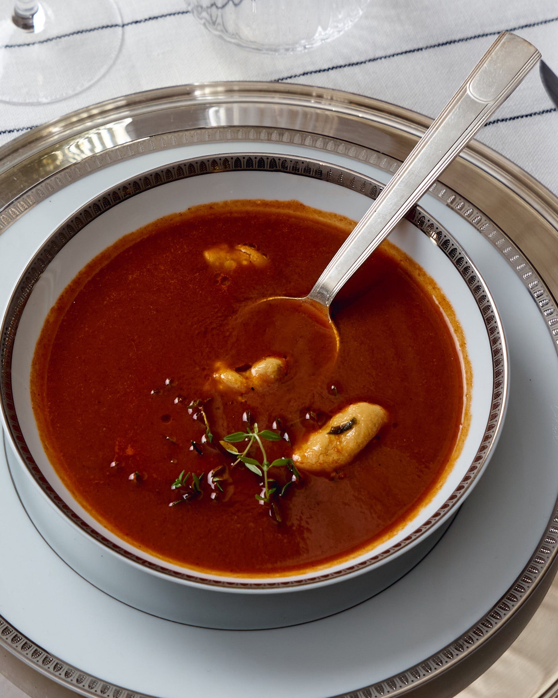 Crema de carabinero elaborada con la mejor selección de ingredientes frescos y naturales cocinados lentamente por Aitor Santamaría.