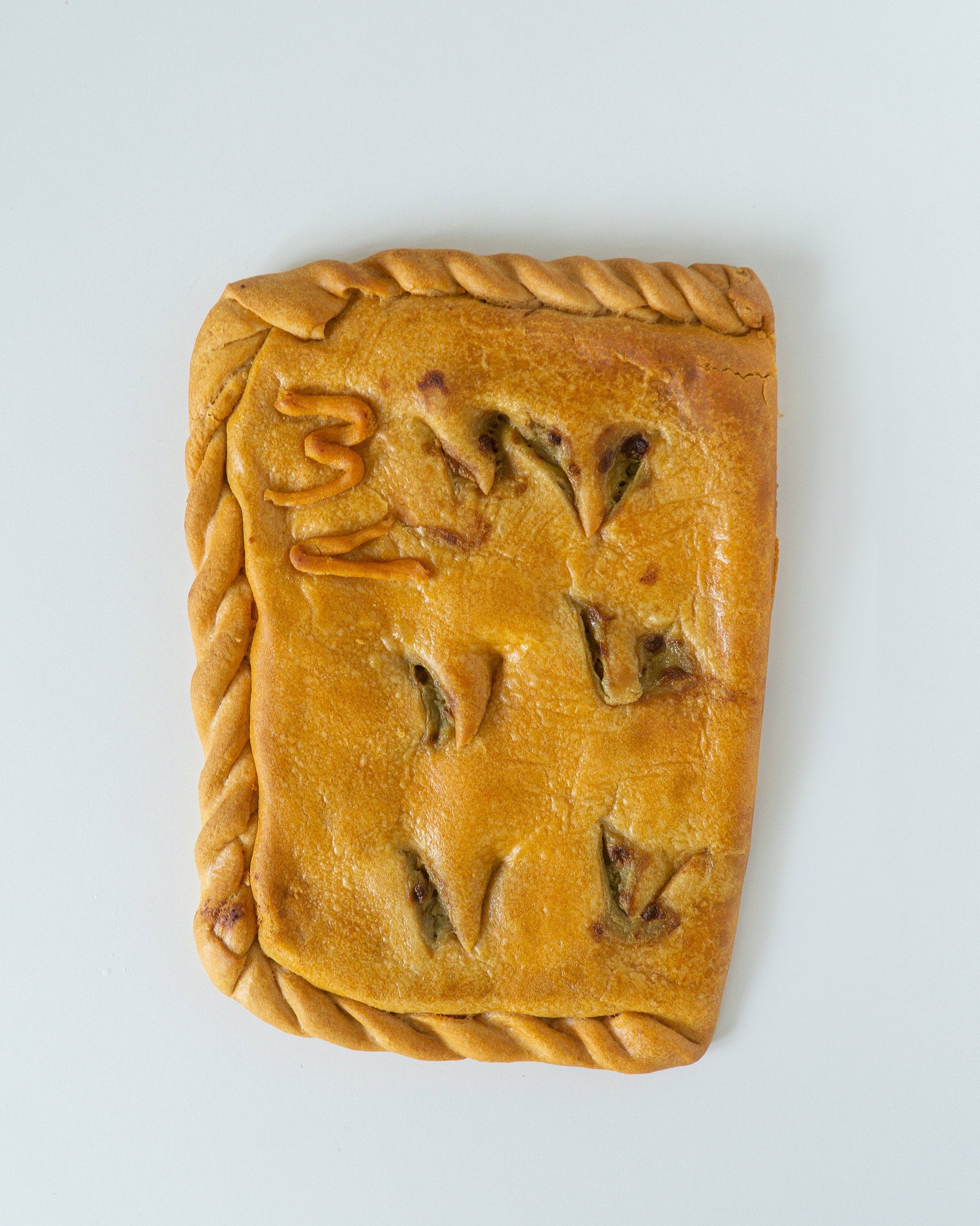 Producto tradicional gallego de panadería compuesto por una masa fina de harina de trigo rellena merluza y berberechos en salsa verde.