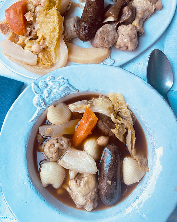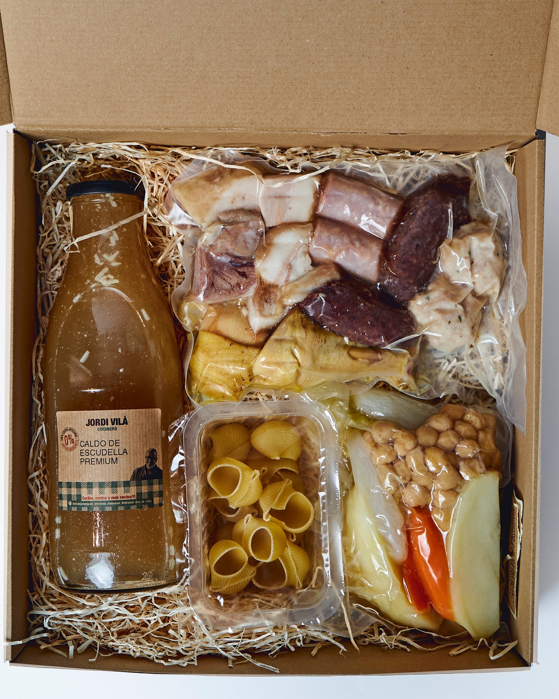 Cocido catalán tradicional listo para calentar y comer elaborado por Jordi Vilà a base de caldo, diferentes tipos de carne, verduras y galets (pasta). Listo en 10 minutos.