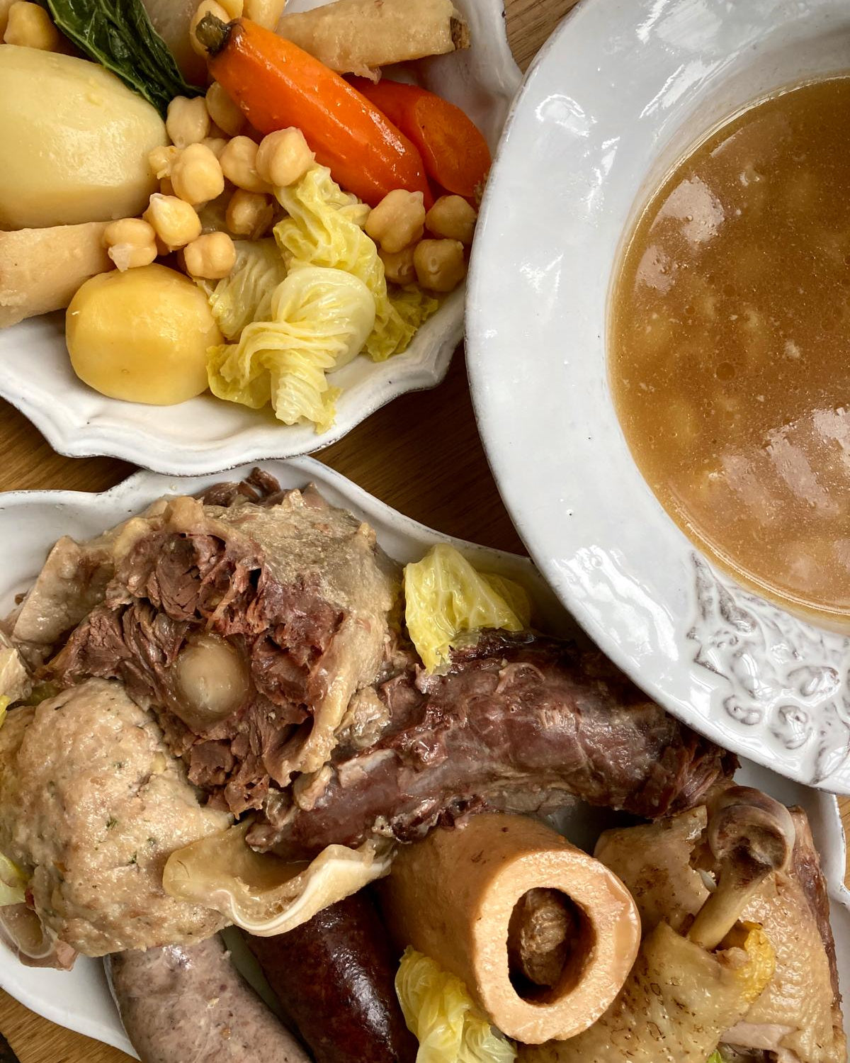 • Su formato en 2 tiempos, es decir, se sirve en 2 platos: primero el caldo con los galets y después las carnes y las verduras que se sirven con un toque de aceite y sal. Aunque también se podrían colocar diferentes piezas de carne y verduras en el mismo plato con el caldo y comerlo todo conjuntamente al estilo de la Escudella (barrejada) mezclada.