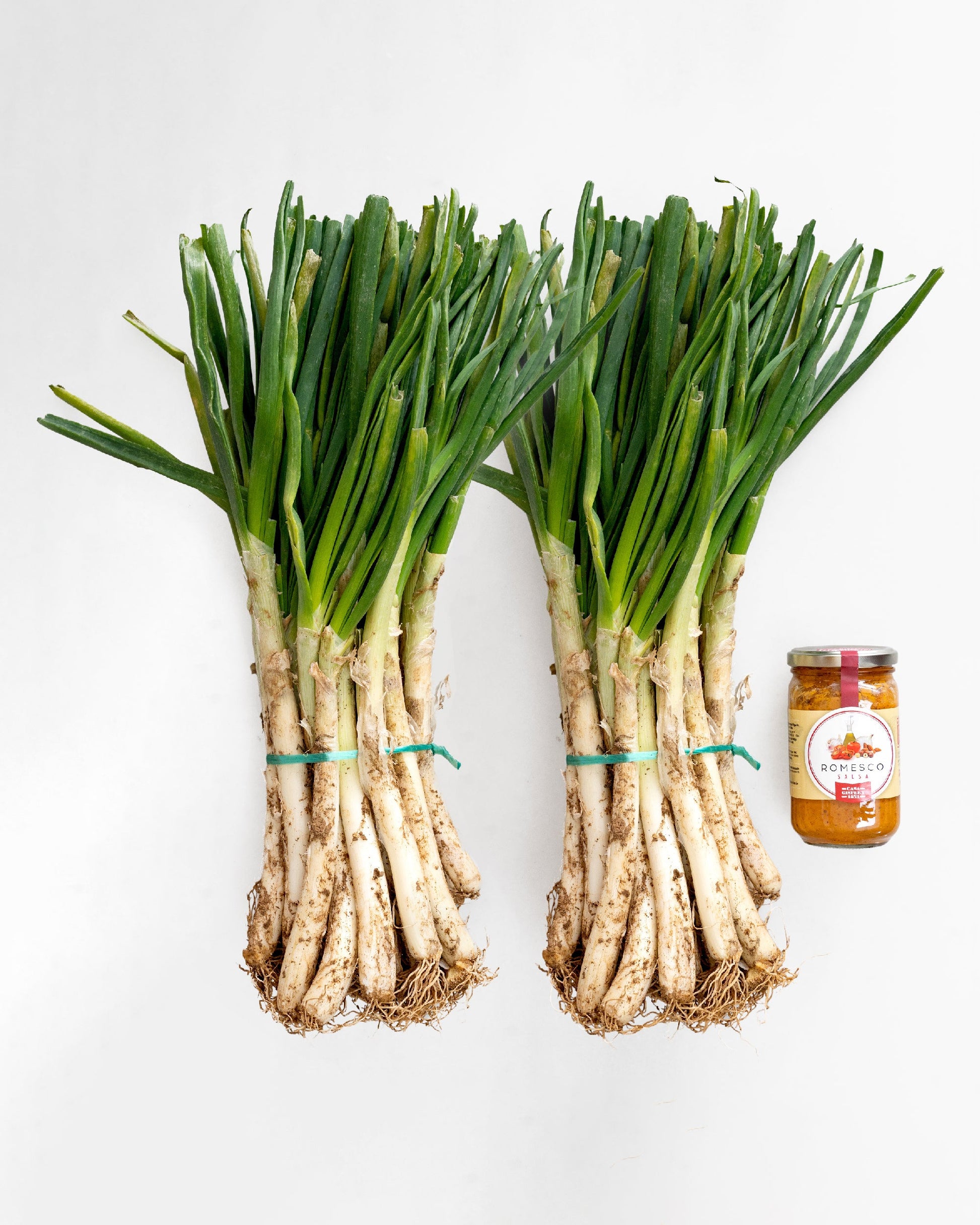 2 ud. de manojo de Calçots. Se cultivan bajo tierra, plantados en surcos de tierra que se “calça” sobre estas cebolletas para mantenerlas tapadas mientras crecen, y de ahí parece que les viene dado el nombre de Calçots. Al comerlos, tienen una textura tierna y un sabor dulce.