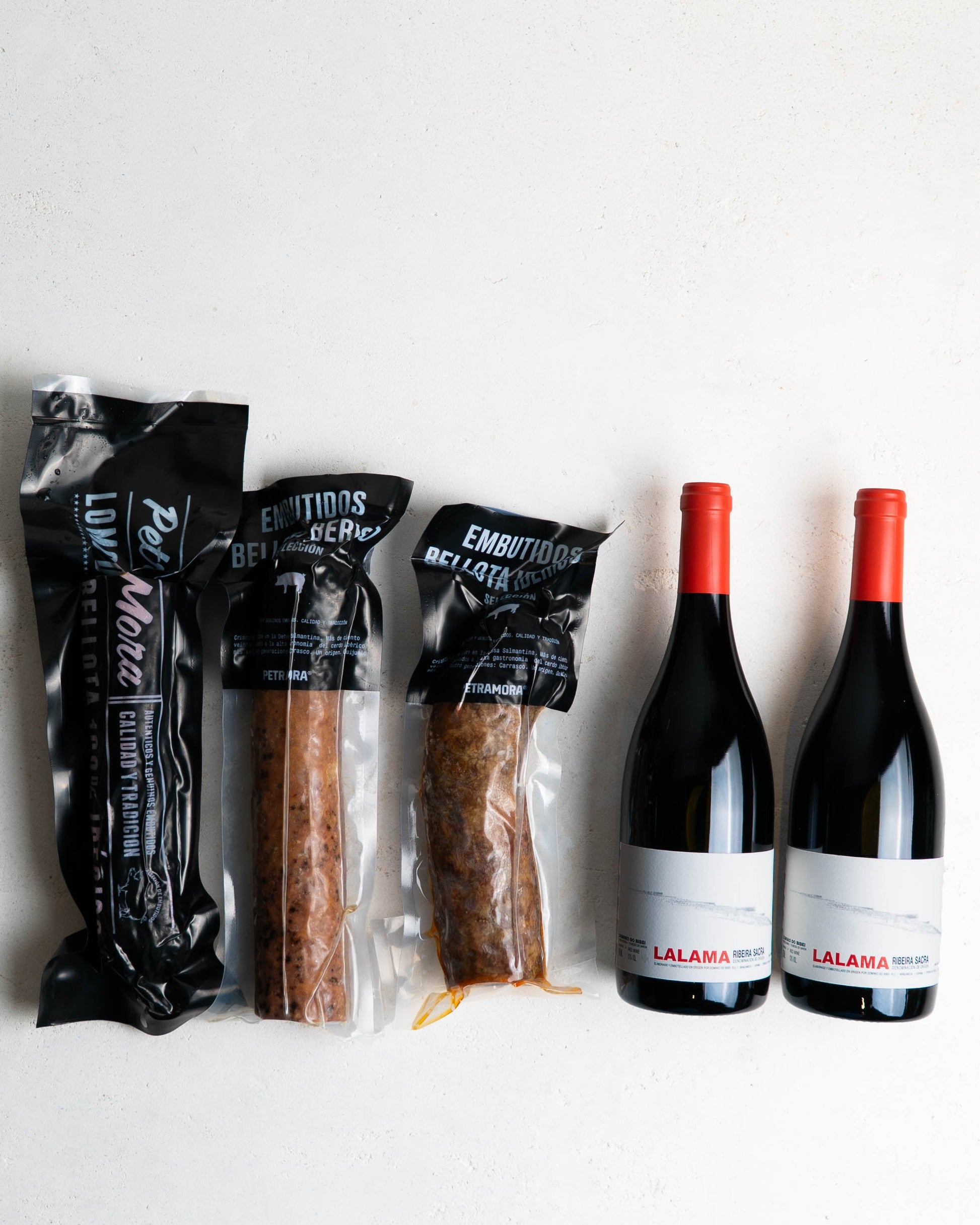 Selección de ibéricos de Carrasco y dos botellas de Ribeira Sacra.