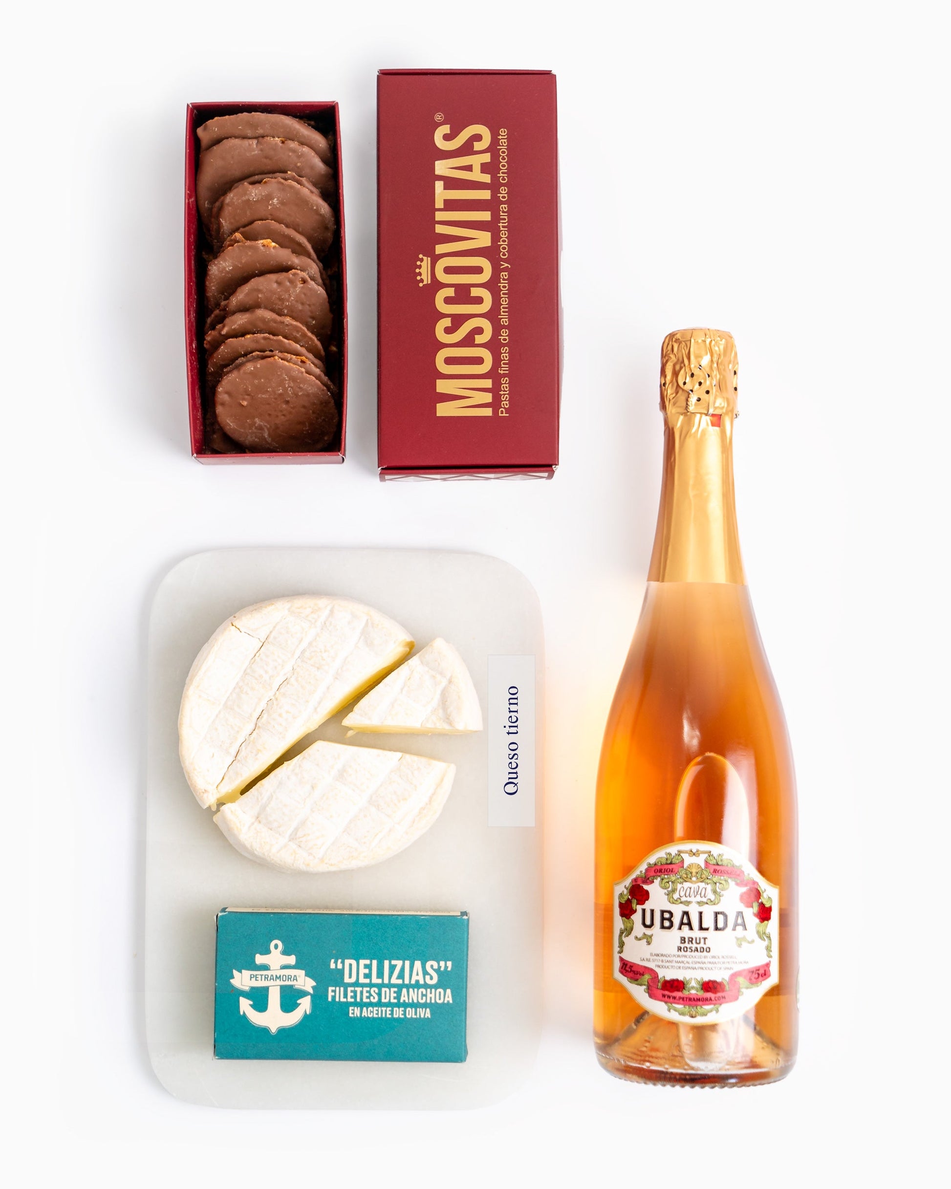 • 1 ud. de Cava brut rosado Ubalda Eco: Cava brut ecológico, elaborado con uva trepat. De burbuja fina, persistente, con aromas fuertes de frutas rojas y notas balsámicas que realzan su vivacidad.