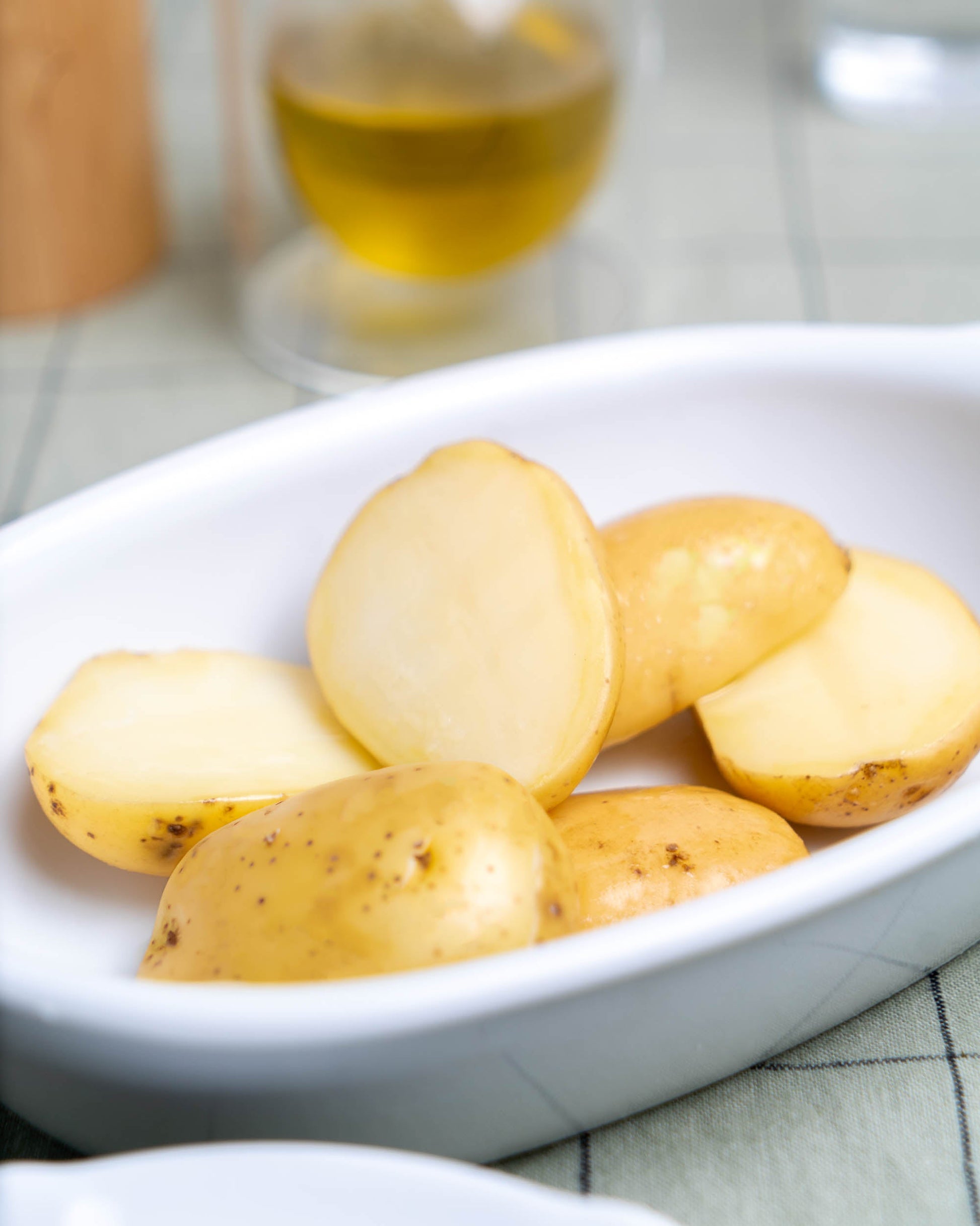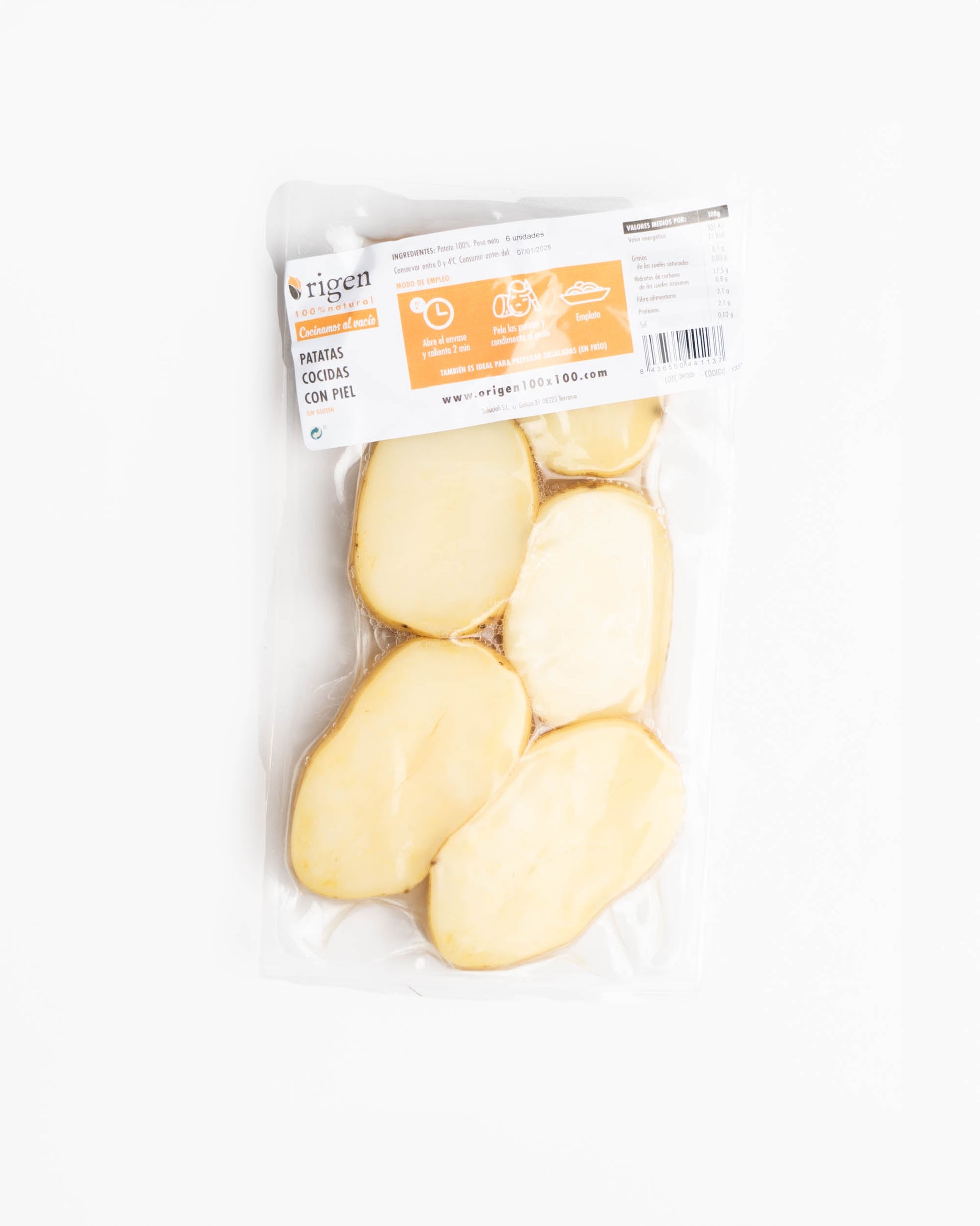 Patata cocida al vacío con piel lista para comer o incorporar en tus recetas. Sólo con un puntito de sal añadida.
