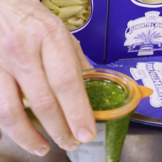 Pesto tradicional elaborado con albahaca fresca, parmesano de 26 meses, piñones, AOVE y sal. Este pesto genovese ha sido elaborado por el cocinero Jordi Vilà, Premi Nacional de Gastronomía, con... Ver más