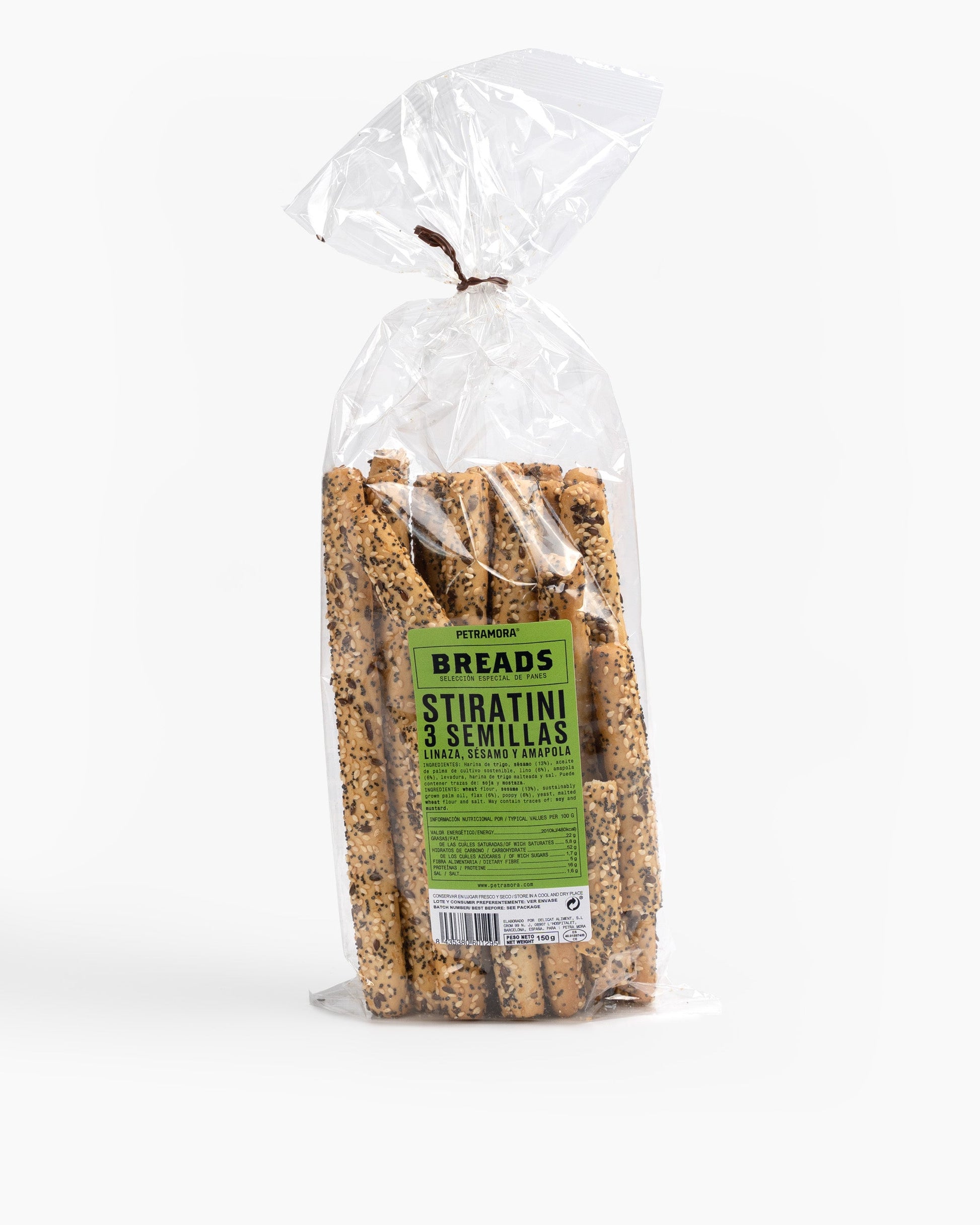 Crujientes bastones de pan elaborados artesanalmente, con semillas de linaza, sésamo y amapola.